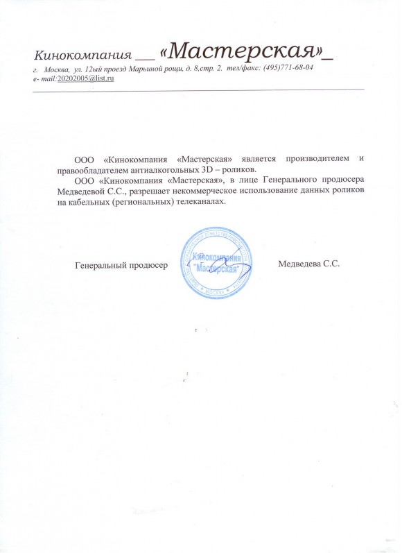 Здравствуйте! вопрос к администратору сайта. Как можно разрешить вопрос об авторском праве на материал ОРТ: Береги себя. Полная версия (ОРТ 2009) Суть дела, что местное ТВ, на которое я обратился с целью показывать ролики, не может решиться их крутить без официального разрешения (нельзя просто скачать и показывать потом что угодно) Не могли бы Вы помочь в этом отношении (у Вас же этот ролик доступен на свободное скачивание и, наверное, для дальнейшего просмотра/показа) Заранее спасибо!