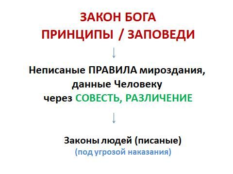 Давайте для простоты изложения здесь понимать "кон" – закон-заповедь Бога, данная человеку через совесть, а За-кон – правила, установленные людьми под угрозой наказания для не принимающих закона-заповедей Бога.