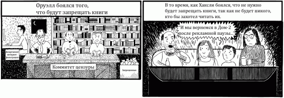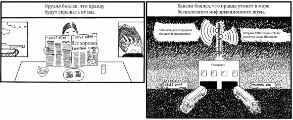 Если сейчас людей оболванивают по сценарию Хаксли, то далее оставшихся сгонят по сценарию Оруэла, если не изменить себя, а через это и развитие событий.